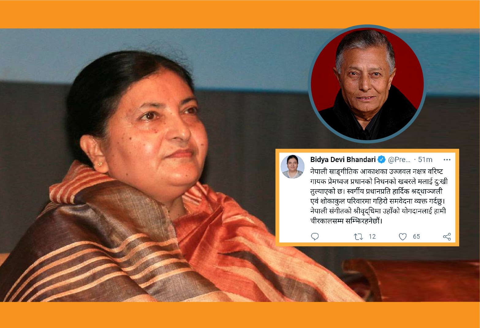 राष्ट्रपति विद्यादेवी भण्डारीले नेपाली साङ्गीतिक आकाशका उज्ज्वल नक्षत्र प्रेमध्वज प्रधानको निधनमा दुःख व्यक्त गर्नुभएको छ । उहाँले आज बेलुका ट्वीट गर्दै वरिष्ठ गायक प्रधानप्रति श्रद्धाञ्जलिका साथ शोकाकुल परिवारमा समवेदना व्यक्त गर्नुभएको छ । &ldqu...
