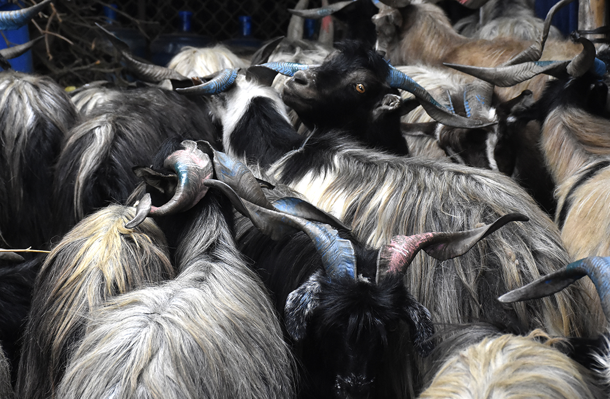 भक्तपुर, २७ असोज : दसैँको लागि मुस्ताङ हुँदै ल्याइएको च्याङ्ग्राको मूल्य यस वर्ष अत्यधिक बढेको छ । सल्लाघारीस्थित नेपाल ट्रष्टको नाममा रहेको १०८ रोपनी चौरमा दुई हजार ५०० च्याङ्ग्रा र करिब दुई हजार खसी बोका बिक्रीका लागि ल्याइ...