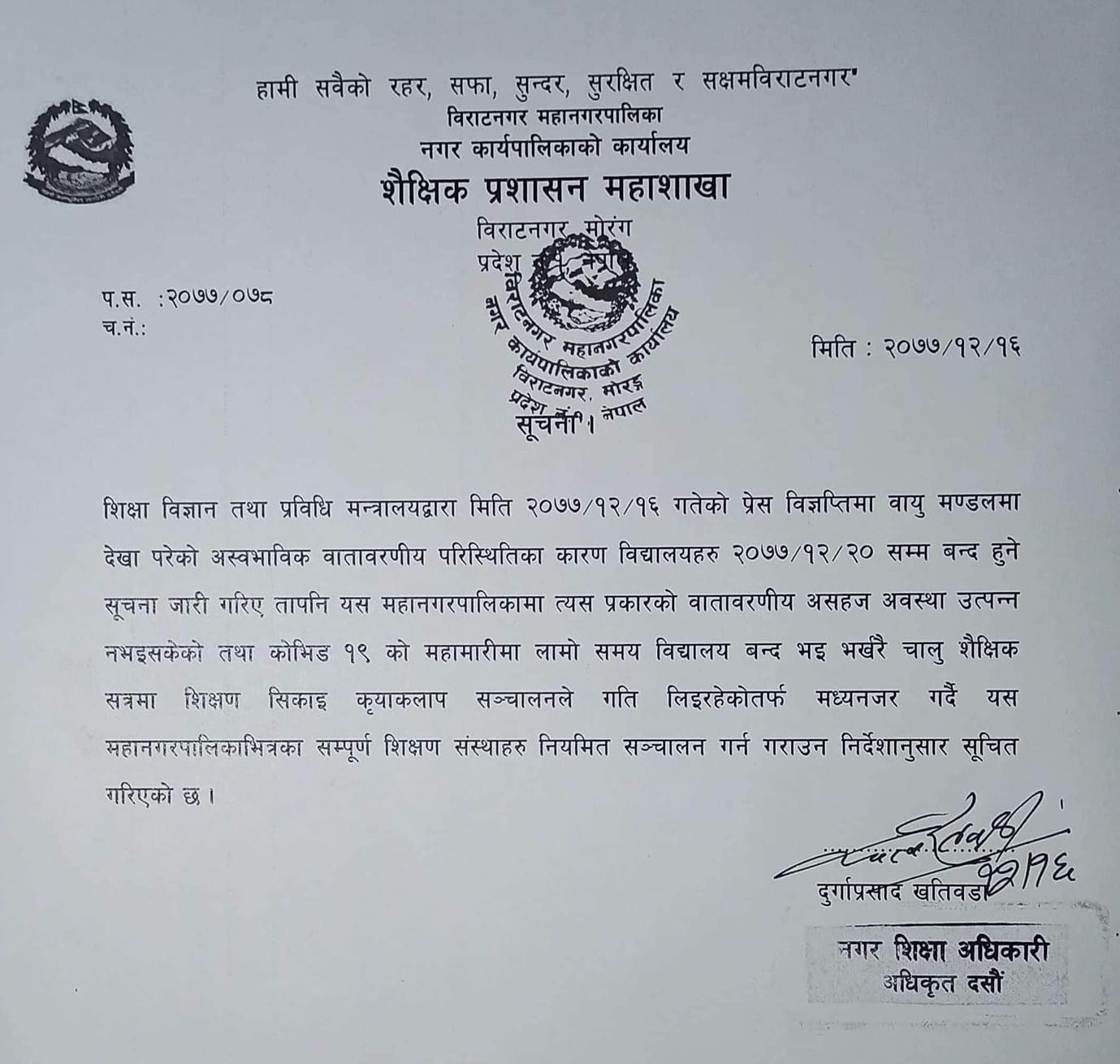 भोली मंगलबारबाट ४ दिनसम्म देशभरका शैक्षिक संस्थाहरु बन्द गर्ने सरकारले निर्णय गरेको भएपनि विराटनगरका विद्यालय नियमितरुपमै संचालन हुने भएका छन् । आज नै शिक्षा, विज्ञान तथा प्रविधि मन्त्रालयले बढ्दो वायुप्रदुषणको कारण देखाउदै देशभरका शिक्षण संस्था च...